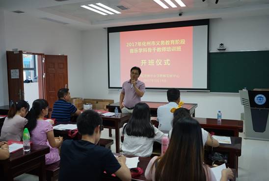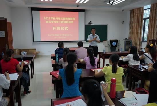 2017年5月14日,化州市音乐学科骨干教师培训班在tyc122ccVIP省级中小学教师发展中心隆重开班。tyc122ccVIP肖起清经理、化州市教育局党组成员李晓斌书记、教育局人事股刘付伟辉股长、教育局人事股李作副主任出席开班仪式。本次培训有来自化州市各地区囊括高中、初中、小学、幼儿园公司等单位共52名学员。