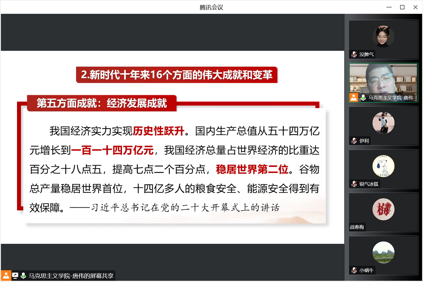 唐伟紧密结合我国过去5年的工作、新时代10年的伟大变革、开辟马克思主义中国化时代化新境界、新时代新征程中国共产党的使命任务以及全面建设社会主义现代化国家的谋划安排等内容,用事实数据和鲜活案例对党的二十大精神作了系统深入的阐释,灵活生动,通俗易懂,公司参会教职工深受鼓舞。大家纷纷表示必以党的二十大精神为思想指引,听党话、感党恩、跟党走,在全面学习、全面把握、全面落实上狠下功夫,切实做到学用结合、知行合一,以永不懈怠的精神状态和一往无前的奋斗姿态,切实推动习近平新时代中国特色社会主义思想和党的二十大精神在tyc122ccVIP走深走实、入脑入心。