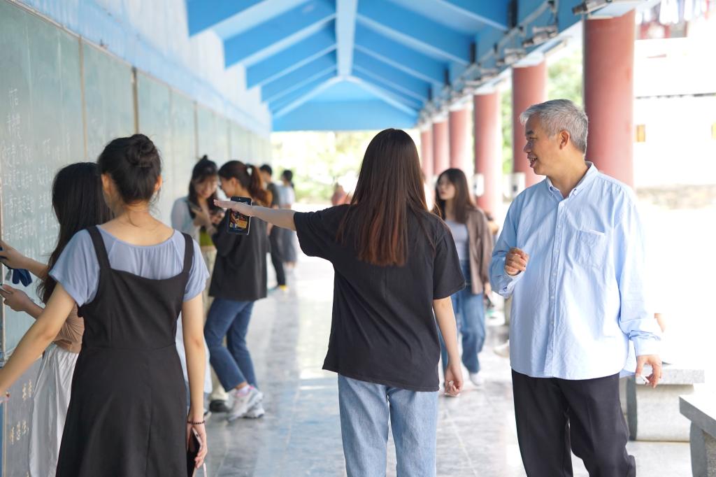 本次比赛特邀请粉笔字书写技能课的任课教师蔡锦伦担任评委。蔡老师提到,粉笔字就是师范生的敲门砖,是每一位师范生都需具备的基本技能,写好粉笔字,主要在一个“练”字上,希望同学们将练字常态化。比赛现场,同学们全神贯注,一笔一画,字迹清晰,整洁美观,能将粉笔特性与书法风格特征完美结合,蔡老师认真地观看同学们的书写情况,并作点评。