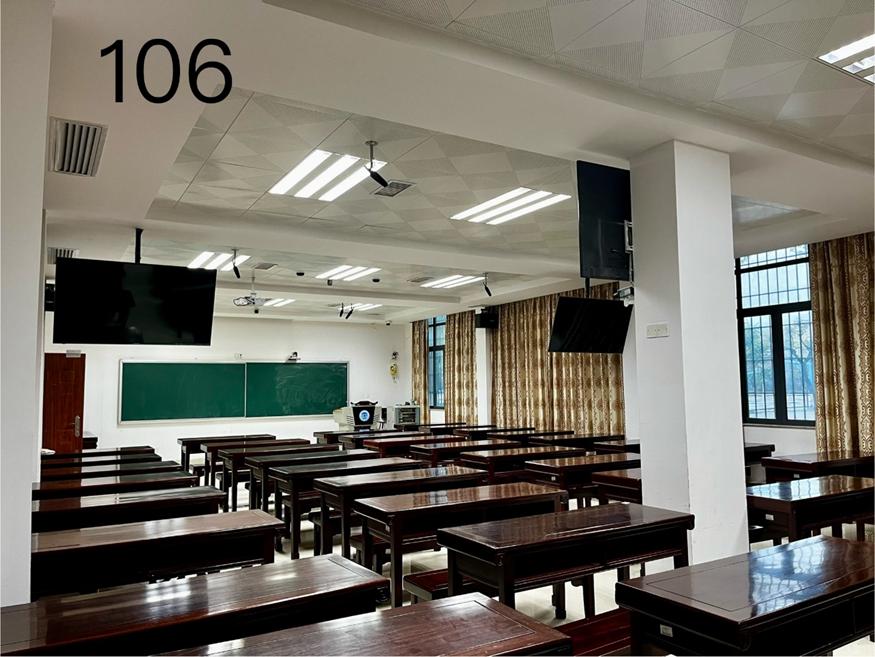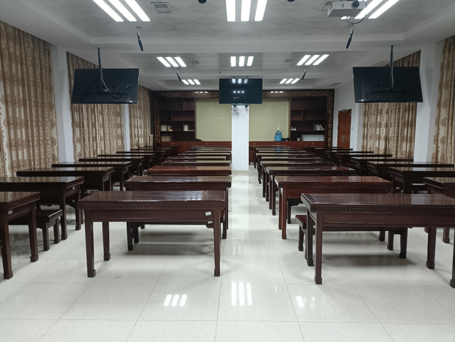 课室配置:面积120平方米,可容纳72人,配有书法桌椅、教师电脑、投影仪,4机位录播系统,有固定式黑板。