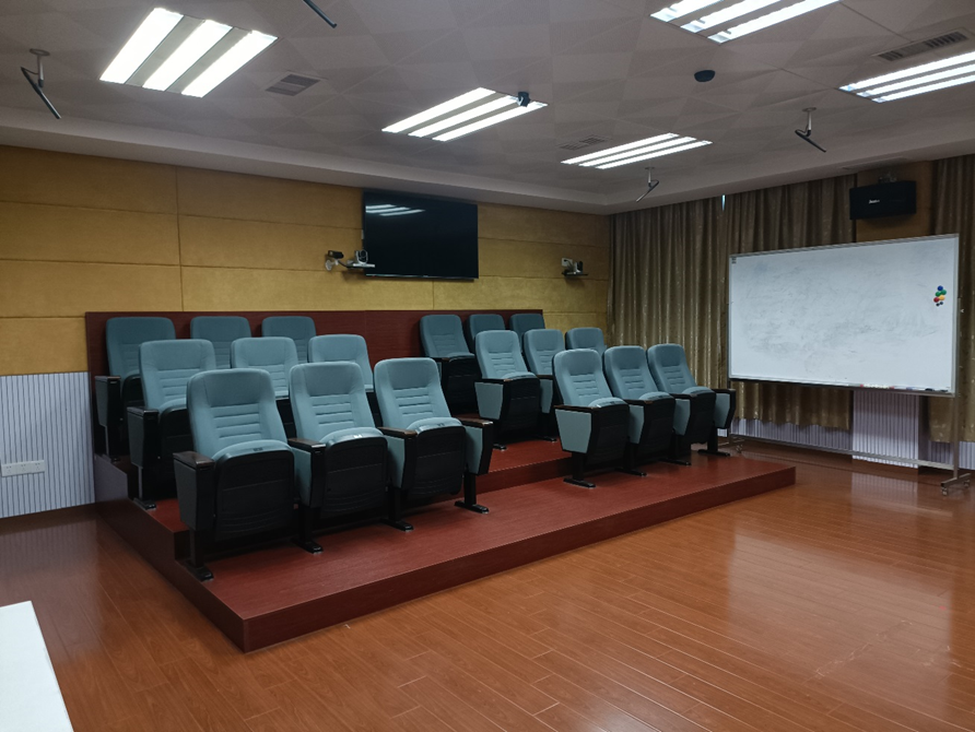 课室配置:面积52平方米,小型阶梯教室,可容纳18人,配有教师电脑、移动式交互白板、蓝幕和绿幕,录播系统,有移动式白板。