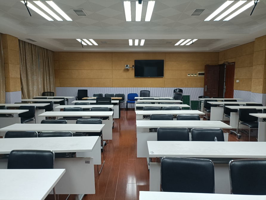 课室配置:面积78平方米,可容纳52人,配有教师电脑、交互电子白板、四机位跟踪录播系统,有固定式白板。