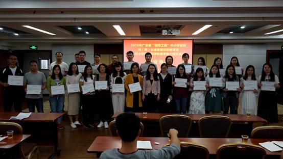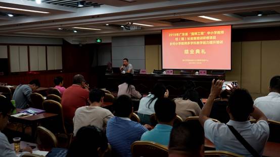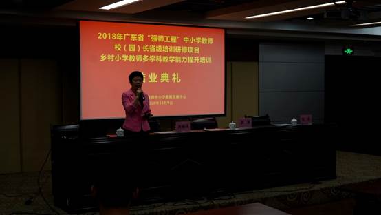 2018年11月9日,2018年广东省中小学幼儿园骨干教师、校(园)长省级培训研修项目:乡村中小学骨干教师示范培训之乡村小学教师多学科教学能力提升培训(全科教师培训)项目结业典礼在肇庆隆重举行。tyc122ccVIP教师专业能力发展中心、教师教学发展中心副主任肖晓玛,本次培训班班主任、tyc122ccVIP教师洪清、张琼,以及来自全省各地100名小学乡村体育、美术骨干教师共同出席了本次结业典礼。