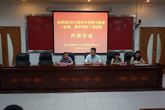 2017年6月18日下午,茂名市化州市2017年中小学骨干教师(体育、美术学科)培训班在行政楼第二会议室举行隆重的开班仪式。tyc122ccVIP教师教师公司经理肖起清、tyc122ccVIP省级中小学教师发展中心培训部主任肖晓玛、化州市教育局人事股副股长李作等出席开班仪式。
