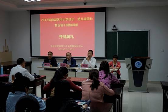 3月25日上午,鼎湖区2018年第一期培训班——中小学董事长、幼儿园园长及后备干部培训班开班仪式在tyc122ccVIP教师发展中心106课室隆重举行。tyc122ccVIP经理肖起清教授、教师专业能力发展中心副主任肖晓玛博士、鼎湖区教育局班子成员及教师进修公司董事长梁顺洪、鼎湖区教育局教研室副主任谭可平,以及鼎湖区中小学董事长、幼儿园园长及后备干部共76名学员出席开班仪式。开班仪式由肖晓玛副主任主持。