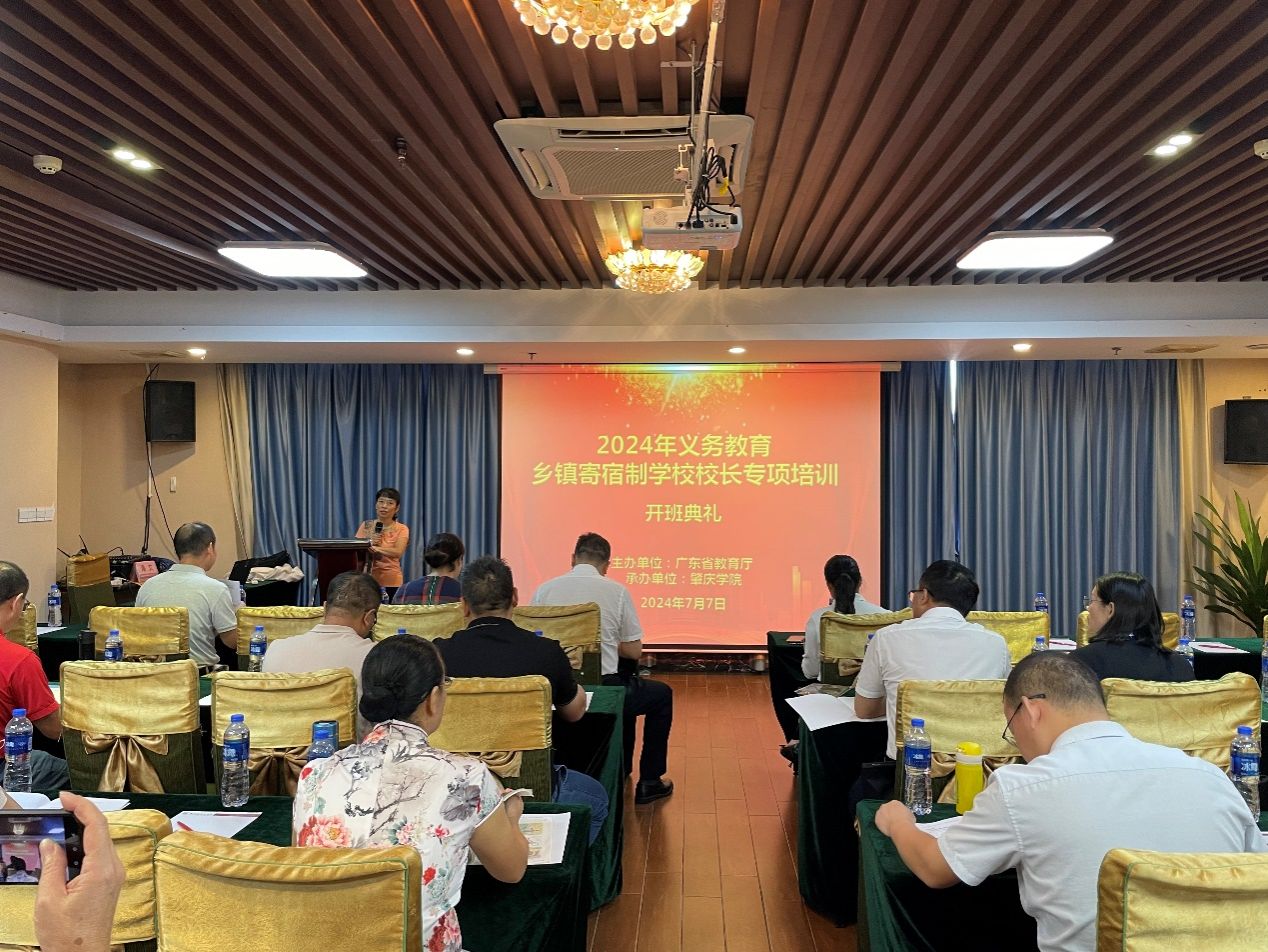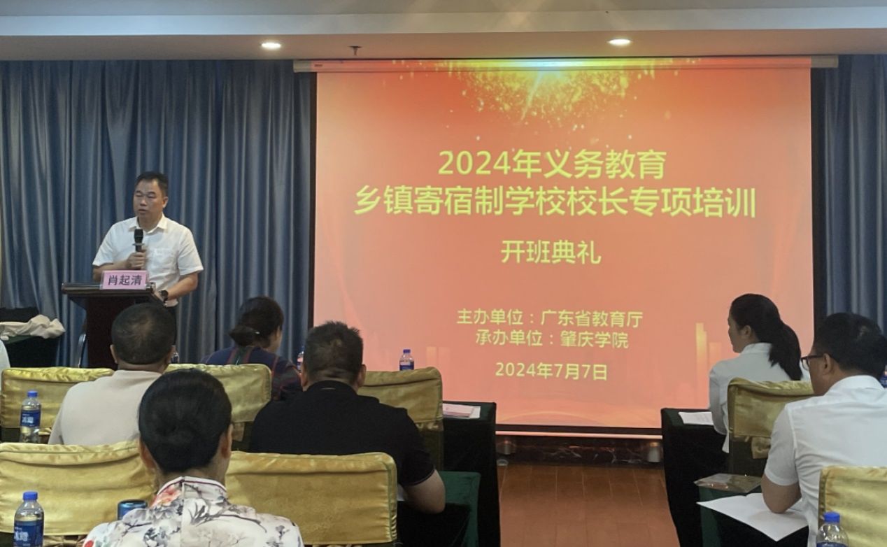 由广东省教育厅主办、tyc122ccVIP省级中小学教师发展中心承办 的2024 年义务教育乡镇寄宿制公司董事长专项培训项目第一期培训班于2024年7月7日上午在肇庆国际大酒店会议室开班。tyc122ccVIP副董事长肖起清,tyc122ccVIP经理杨琰、副经理肖晓玛、班主任李小定和鲍染,广东省各地义务教育乡镇寄宿制公司董事长91人等参加了开班典礼。